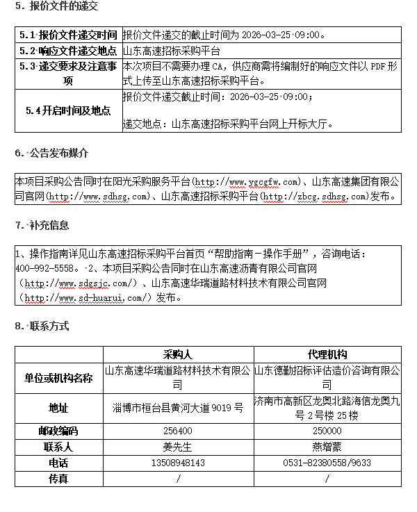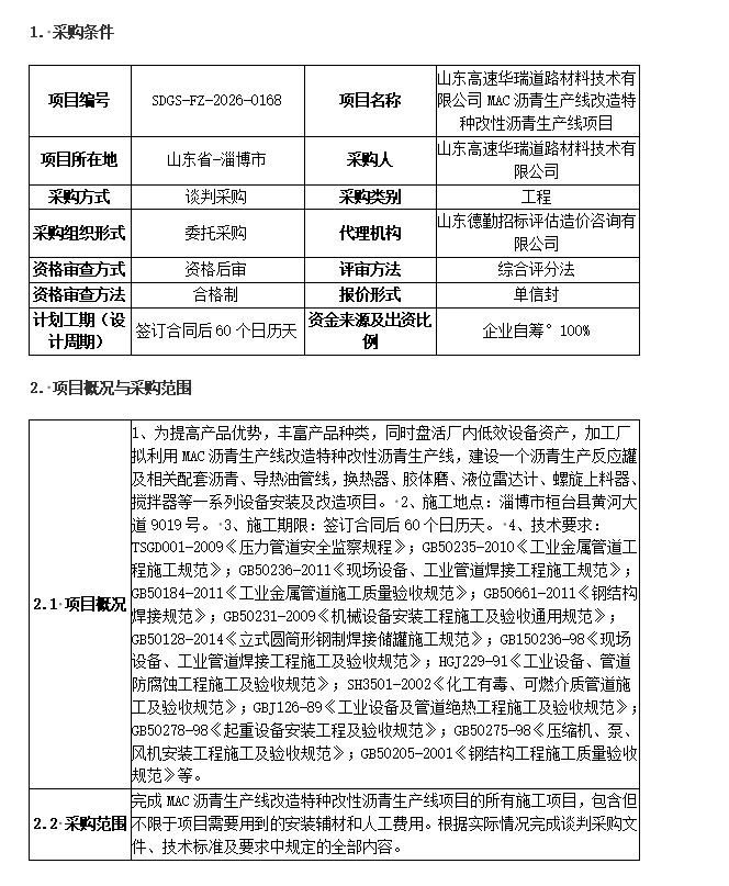 山東高速華瑞道路材料技術有限公司MAC瀝青生產(chǎn)線改造特種改性瀝青生產(chǎn)線項目談判采購公告