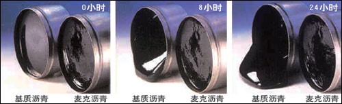 MAC??改性劑在瀝青中通過化學(xué)反應(yīng)生成大量極性物質(zhì)并產(chǎn)生聚集,形成網(wǎng)狀格架結(jié)構(gòu),使瀝青的內(nèi)聚力大大增強,可生產(chǎn)出高粘度改性瀝青。同時由于瀝青極性的加強,使瀝青與集料表面的粘附性增強。基于上述兩種原因,瀝青與集料膠結(jié)體系的膠結(jié)強度也隨之大大提高。MAC??改性瀝青呈凝膠狀,這種凝膠結(jié)構(gòu)使瀝青不會輕易移動,且其品質(zhì)穩(wěn)定,不會產(chǎn)生離析。室溫下,基質(zhì)瀝青或其他改性瀝青隨時間流逝而流動,而MAC??改性瀝青不隨時間而流動。