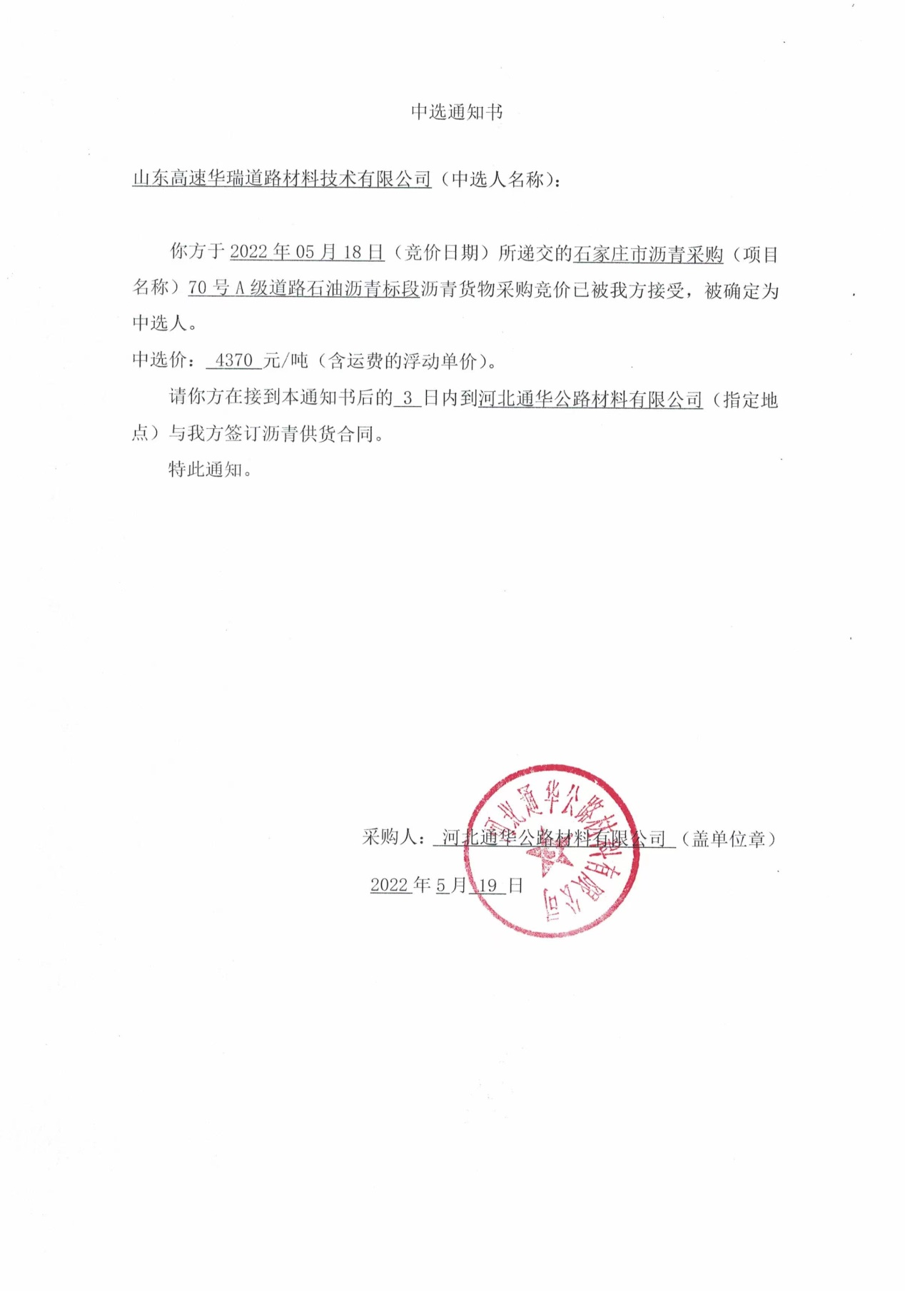 山東高速華瑞公司成功中選河北通華公路材料公司石家莊市瀝青采購項目