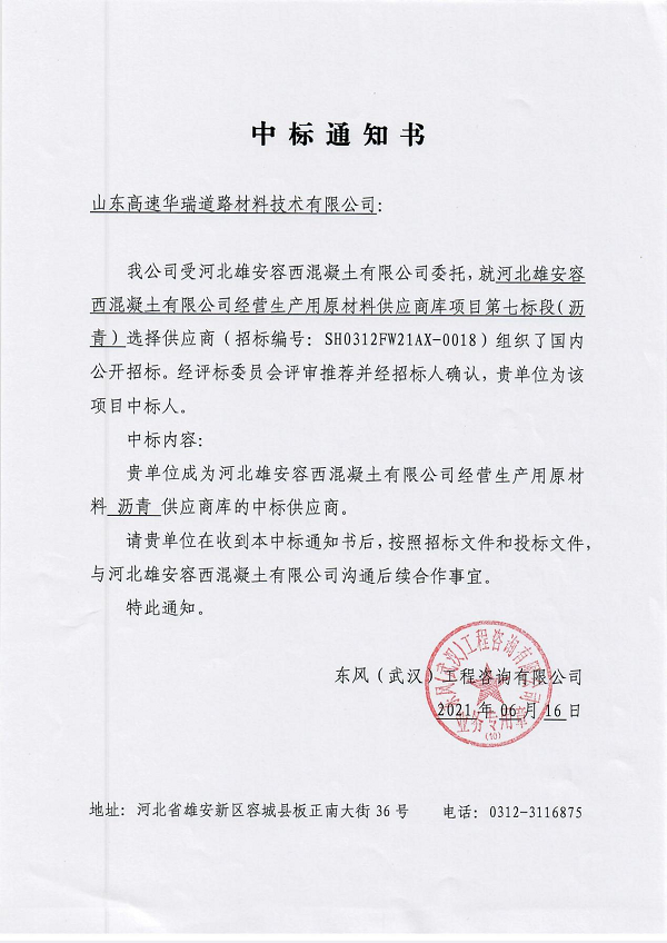 根據(jù)河北雄安容西混凝土有限公司2021年經(jīng)營生產(chǎn)需求,瀝青標(biāo)段共需各類瀝青約2萬噸(70號瀝青暫估需求量1.5萬噸、改性瀝青SBS I-C暫估需求量0.1萬噸、改性瀝青SBS I-D暫估需求量0.4萬噸),華瑞公司以第二名的成績成功入圍其供應(yīng)商庫。