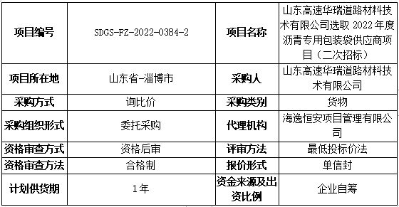 山東高速華瑞道路材料技術(shù)有限公司選取2022年度瀝青專用包裝袋供應(yīng)商項(xiàng)目(二次招標(biāo))詢比采購公告