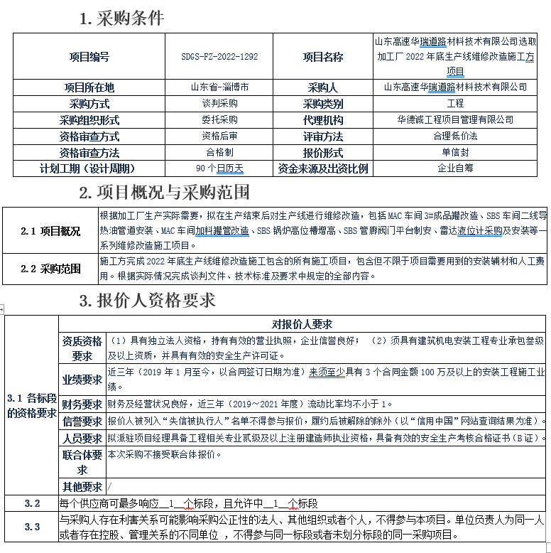 山東高速華瑞道路材料技術(shù)有限公司選取加工廠2022年底生產(chǎn)線維修改造施工方項(xiàng)目談判采購(gòu)公告