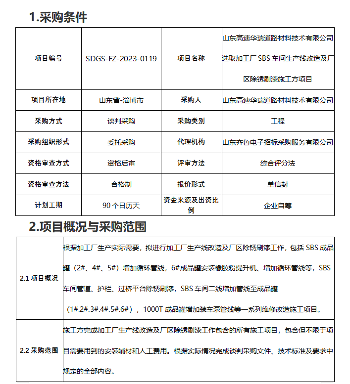 山東高速華瑞道路材料技術(shù)有限公司選取加工廠SBS車間生產(chǎn)線改造及廠區(qū)除銹刷漆施工方項目談判采購公告