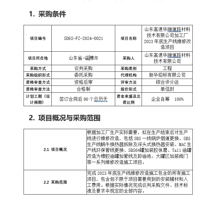 山東高速華瑞道路材料技術(shù)有限公司加工廠2023年底生產(chǎn)線維修改造項(xiàng)目談判采購公告