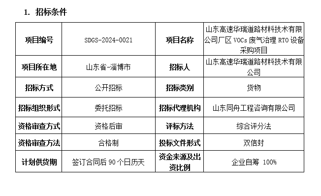 山東高速華瑞道路材料技術(shù)有限公司 廠區(qū)VOCs廢氣治理RTO設(shè)備采購項目招標(biāo)公告