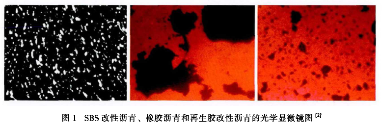 聚合物改性劑一般可分為三類:樹脂類,如聚乙烯(PE)、乙烯-醋酸乙烯共聚物(EVA)等;熱塑性彈性體類,如苯乙烯-丁二烯嵌段共聚物(SBS)、苯乙烯-異戊二烯嵌段共聚物(SIS)、聚氨酯、有機硅氧烷等;橡膠類,如丁苯橡膠(SBR)、無歸聚丙烯(APP)、廢膠粉(GTR)等。顯微鏡圖見圖1。