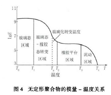 無定形聚合物的模量隨溫度變化表現(xiàn)出4種不同的狀態(tài),分別對應(yīng)聚合物的玻璃態(tài)、玻璃態(tài)-橡膠態(tài)轉(zhuǎn)變、橡膠態(tài)和黏流態(tài)。見圖4。玻璃化轉(zhuǎn)變溫度是聚合物由玻璃態(tài)至橡膠態(tài)轉(zhuǎn)變對應(yīng)的溫度,此時材料由脆性轉(zhuǎn)變?yōu)閺椥誀顟B(tài)。聚合物改性瀝青從廣義上屬千聚合物范疇,其低溫開裂的實質(zhì)是瀝青在實際使用溫度時處于玻璃態(tài),從而發(fā)生脆性斷裂,該現(xiàn)象與其粘彈性行為相對應(yīng)[18]。因此,可用玻璃化轉(zhuǎn)變溫度評價瀝青的低溫性能。材料的玻璃化轉(zhuǎn)變溫度越低越好,當(dāng)其遠(yuǎn)低千改性瀝青的最低服務(wù)溫度時,瀝青材料處于高彈性,通過變形可有效釋放溫度變化引起的內(nèi)部應(yīng)力,減少低溫開裂的產(chǎn)生。