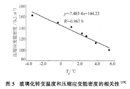材料的玻璃化轉(zhuǎn)變溫度可由升降溫過程中物理性質(zhì)(如體積、熱力學(xué)性質(zhì)、電磁性質(zhì)以及力學(xué)性質(zhì))突變所對應(yīng)的溫度確定。其中,示差掃描量熱法(DSC)由于樣品用量少,測試精度高,被廣泛用于材料玻璃化轉(zhuǎn)變溫度的確定。Zhang等(20]通過大量DSC試驗證實改性瀝青的玻璃化轉(zhuǎn)變溫度與其低溫性能存在直接對應(yīng)關(guān)系,說明采用玻璃化轉(zhuǎn)變溫度表征聚合物改性瀝青的低溫性能具有理論和實際可行性。不同的聚合物改性瀝青對應(yīng)不同的玻璃化轉(zhuǎn)變溫度,這是因為聚合物存在不同的結(jié)晶形態(tài)和吸放熱,同時聚合物與瀝青的相容性以及兩者相互作用不同[19,21]。動態(tài)力學(xué)分析法(DMA)通過測定瀝青材料的動態(tài)力學(xué)譜以確定玻璃化轉(zhuǎn)變溫度。牛巖等[22]利用DMA在彎拉受力模式下得到了基質(zhì)瀝青、SBS改性瀝青以及橡膠瀝青及其混合料的玻璃化轉(zhuǎn)變溫度。研究發(fā)現(xiàn),不同改性瀝青及其混合料的玻璃化轉(zhuǎn)變溫度區(qū)分明顯,與混合料的低溫性能相關(guān)性好;相比改性瀝青的玻璃化轉(zhuǎn)變溫度,采用混合料的玻璃化轉(zhuǎn)變溫度評價其低溫性能更加合理。然而,與延度和弗拉斯脆點法相比,采用玻璃化轉(zhuǎn)變溫度評價改性瀝青低溫性能的研究較少,涉及的改性瀝青種類有限,因此仍需進(jìn)一步開展相關(guān)研究。5種改性瀝青的延度和玻璃化轉(zhuǎn)變溫度比較見表3。玻璃化轉(zhuǎn)變溫度和壓縮應(yīng)變能密度的相關(guān)性[19]見圖5。