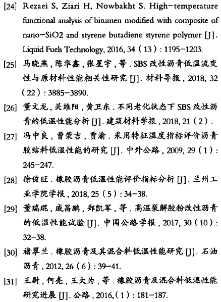 瀝青路面憑借修建、養(yǎng)護周期短,路面平整,行車舒適等優(yōu)勢被廣泛應(yīng)用于道路建設(shè)。然而,部分地區(qū)冬季嚴(yán)寒(最低溫度達(dá)-30℃以下),低溫持續(xù)時間長,雨雪天氣頻繁,致使瀝青路面受凍產(chǎn)生疲勞裂縫;此外,較大的晝夜溫差使得路表變溫顯著,產(chǎn)生溫縮裂縫,嚴(yán)重縮短了路面的使用壽命。在瀝青中加入聚合物,借助聚合物本身的結(jié)構(gòu)特性或聚合物與瀝青間的相互作用,有助于提高瀝青材料的軟化點,降低其脆化溫度,同時提高路面的耐久性能。